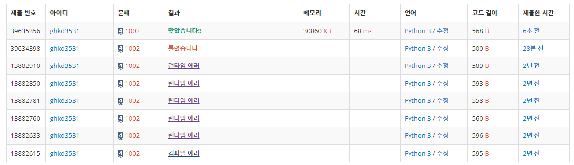 [Python][백준] 1002번 문제 풀이 | 2년 만에 푼 문제Algorithm/백준 2022. 2. 28. 10:00728x90