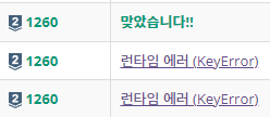 def dfs(graph, start): visited = list() stack = list() # 리스트 자료구조를 스택처럼 사용. stack.append(start) while stack: node = stack.pop() if node not in visited: visited.append(node) if node in graph: # 왜 이렇게 했는지는 밑에서 설명하겠다! stack.extend(sorted(graph[node], reverse=True)) # 딕셔너리의 요소를 뒤집어 스택에 넣어, 작은 수부터 방문하게 설계 return visited def bfs(graph, start): visited = list() deque = deque() # 덱 자료구조를 사용하여, 실행시간 개선 deque.append(start) while deque: node = deque.popleft() # FIFO if node not in visited: visited.append(node) if node in graph: # 왜 이렇게 했는지는 밑에서 설명하겠다! queue.extend(sorted(graph[node])) return visited런타임 에러 (KeyError) 해결